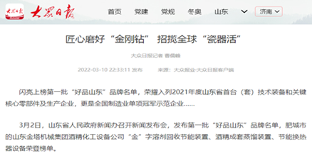 榮耀閃閃,品牌彰顯。 近日,2022年山東省優(yōu)質(zhì)品牌榜單揭曉。山東金塔機(jī)械集團(tuán)“廢液蒸發(fā)成套裝備”、“用于熱敏性物料的蒸發(fā)裝置”榮耀上榜。至此,自2019年榜單發(fā)布以來(lái),金塔集團(tuán)共有10項(xiàng)產(chǎn)品榮獲山東優(yōu)質(zhì)品牌稱(chēng)號(hào)。 山東金塔集團(tuán)守正創(chuàng)新強(qiáng)主業(yè),精耕細(xì)作鑄品牌,突出以科技創(chuàng)新強(qiáng)化品牌支撐,年年出成果,歲歲有專(zhuān)利,新工藝、新技術(shù)、新產(chǎn)品拓寬了市場(chǎng)新領(lǐng)域。作為《酒精蒸餾塔》、《糠醛水解鍋》、《糠醛蒸餾塔》等20余項(xiàng)國(guó)家行業(yè)標(biāo)準(zhǔn)的制定者,金塔集團(tuán)聚焦雙碳目標(biāo),把控綠色節(jié)能方向,牢牢占據(jù)行業(yè)制高點(diǎn),贏(yíng)得了市場(chǎng)話(huà)語(yǔ)權(quán)。通過(guò)深入實(shí)施品牌戰(zhàn)略,致力打造自主品牌,金塔產(chǎn)品質(zhì)量?jī)?yōu)、品質(zhì)好、標(biāo)準(zhǔn)化的綜合優(yōu)勢(shì)得到全方位厚植。 金塔品牌靚,展示好形象?!敖稹弊旨皥D商標(biāo),中國(guó)馳名商標(biāo);首批“好品山東”,金塔榮耀其中;山東優(yōu)質(zhì)品牌,連年完美上榜…金塔在出新中更加出彩,品牌在打造中愈加閃亮。 品牌閃爍,金塔增色。以品牌樹(shù)形象,以品牌闖市場(chǎng),金塔品牌之路越走越寬廣,為助推企業(yè)高質(zhì)量發(fā)展注入了強(qiáng)大動(dòng)能。